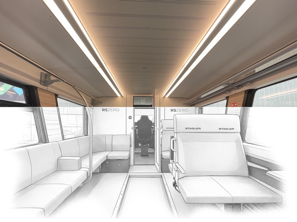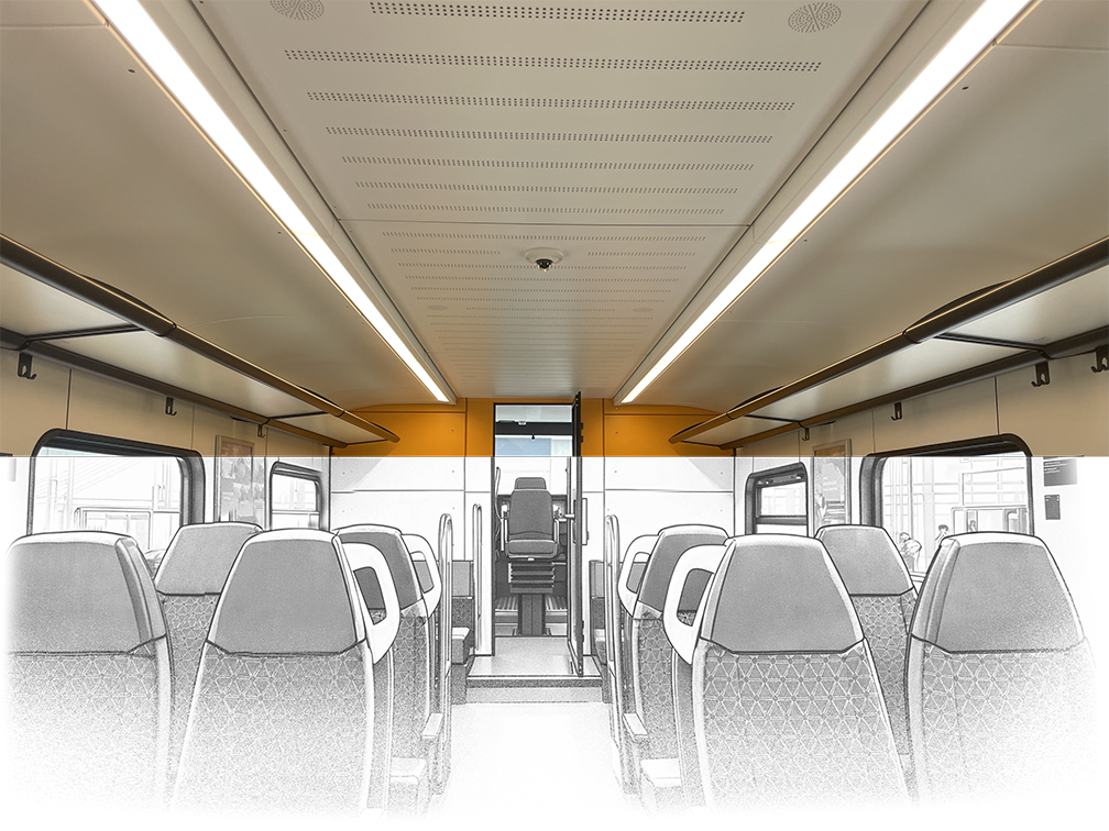 Der Luftkanal wird je nach Kundenwunsch aus einer Vielzahl von Leichtbaumaterialien gefertigt. Diese Kombination ermöglicht es uns, die Deckensysteme mit optimiertem Gewicht zu liefern und gleichzeitig den erforderlichen Brandschutz gemäß EN 45545 zu erfüllen. Vorverdrahtete Beleuchtungssysteme und weitere elektronische Komponenten wie Lautsprecher, Kameras und Bildschirme sind vollständig integriert.